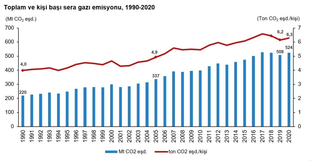 TÜİK, Türkiye’nin 2020 yılına dair seragazı emisyon rakamlarını açıkladı. Sera gazı envanteri sonuçlarına göre, 2020 yılı toplam sera gazı emisyonu bir önceki yıla göre %3,1 artarak 523,9 milyon ton (Mt) CO2 eşdeğeri (eşd.) olarak hesaplandı. Kişi başı toplam sera gazı emisyonu 1990 yılında 4 ton CO2 eşd., 2019 yılında 6,2 ton CO2 eşd. ve 2020 yılında 6,3 ton CO2 eşd. olarak hesaplandı.